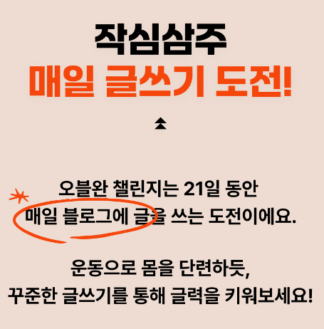 오블완 챌린지는 21일 동안 매일 블로그에 글 쓰는 도전이에요. 운동으로 몸을 단련하듯, 꾸준한 글쓰기를 통해 글력을 키워보세요!