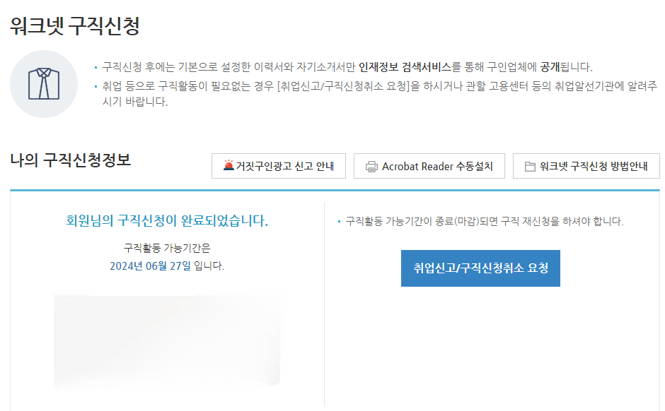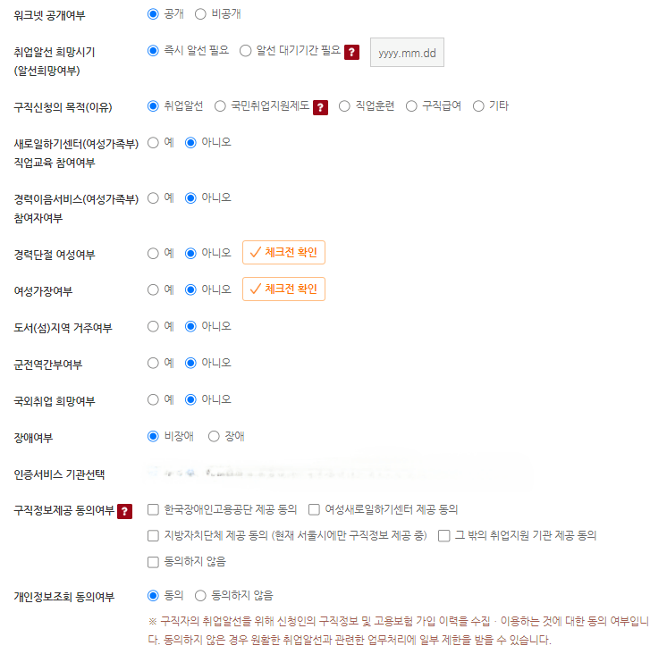 워크넷에 구직 등록 후 내가 원하지 않는 회사에서 연락 올 가능성이 크기 때문에 '공개 여부는 비공개'로 하는 것이 좋습니다. '사유는 구직급여 수급'으로 적어주세요.