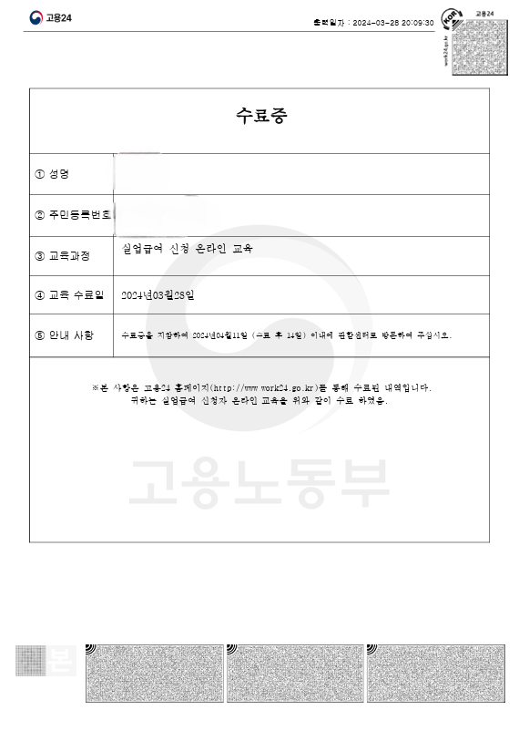 온라인 교육을 진행해야 구직급여(=실업급여) 신청을 할 수 있습니다. 교육을 들을 때 반응이 없으면 로그아웃되어 처음부터 다시 신청해야 하니 로그아웃 되지 않도록 주의해 주세요.